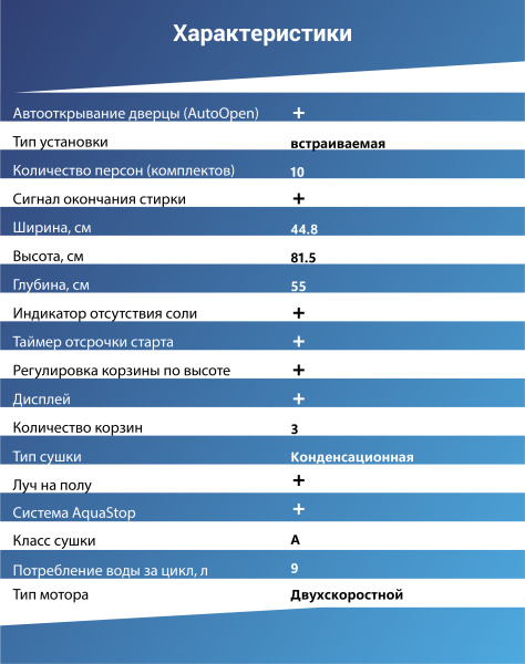 В машине есть три корзины, которые регулируются по высоте, что позволяет удобно разместить посуду любого размера. Система Aqua Stop предотвращает протечки, автоматически отключая подачу воды при повреждении шланга или накоплении воды в поддоне.
